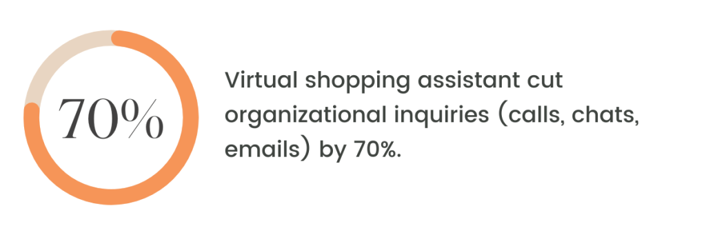 Virtual shopping assistants, as highlighted by Gartner, contribute significantly to organizations by reducing call, chat, and email inquiries by a substantial 70%. 15 This reduction not only streamlines customer support operations but also allows businesses to allocate resources more efficiently.