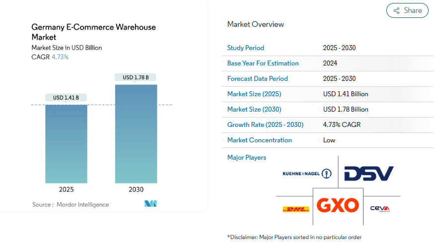 Then you’ve got warehousing & fulfillment. The warehouse market for e-commerce in Germany is expected to hit $1.41 billion in 2025, growing steadily through to 2030.