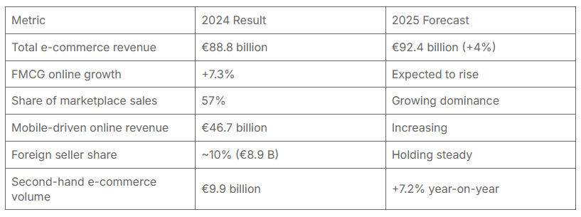 E-commerce in Germany is bouncing back. In 2024, total online sales (goods only) climbed ~3.8% to about €88.8 billion. In 2025, this number is expected to reach €92.4 billion. The growth rate isn’t explosive (+4%), but steady. Also, BEVH & the EHI Retail Institute forecast ~2.5% growth in goods-ecommerce for 2025.