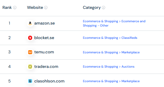 In Sweden, we can point out some of the top online retailers who make noise in the e-commerce world. According to SimilarWeb, the top 5 websites in e-commerce & shopping ranking are: