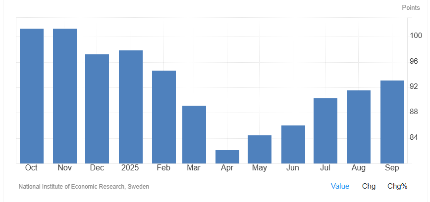 In terms of consumer confidence, it’s messy here. Sentiment in Sweden has improved slightly, rising to 93.2 in September 2025 from 91.6 in August, marking the best level since February – but it’s still below long-term norms.