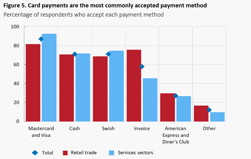 Cards (Visa, Mastercard, etc.) are still a staple. Many merchants accept them for both offline and online purchases. In fact, among small businesses, card payments are the most accepted method.