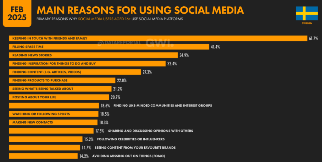 Swedes are active participants who engage with content, brands, and friends across various platforms. The top three reasons for using social media are: