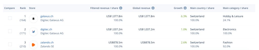On the supply side, local leader Galaxus reported CHF 3.23 billion platform sales in 2024 (+18% YoY), growing share at home and next-door EU markets. ECDB’s 2024 store ranking likewise shows galaxus.ch and digitec.ch topping Swiss GMV.