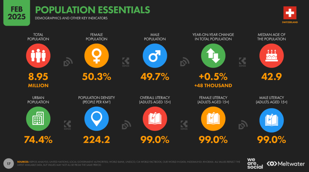 In early 2025, Switzerland counted ~6.7 million social media identities (~75% of the population). Instagram reaches roughly 3.7 million, LinkedIn has surged to ~4.9 million members, and TikTok ad reach covers ~24% of internet users—useful markers for channel planning, content, and retail media buys.