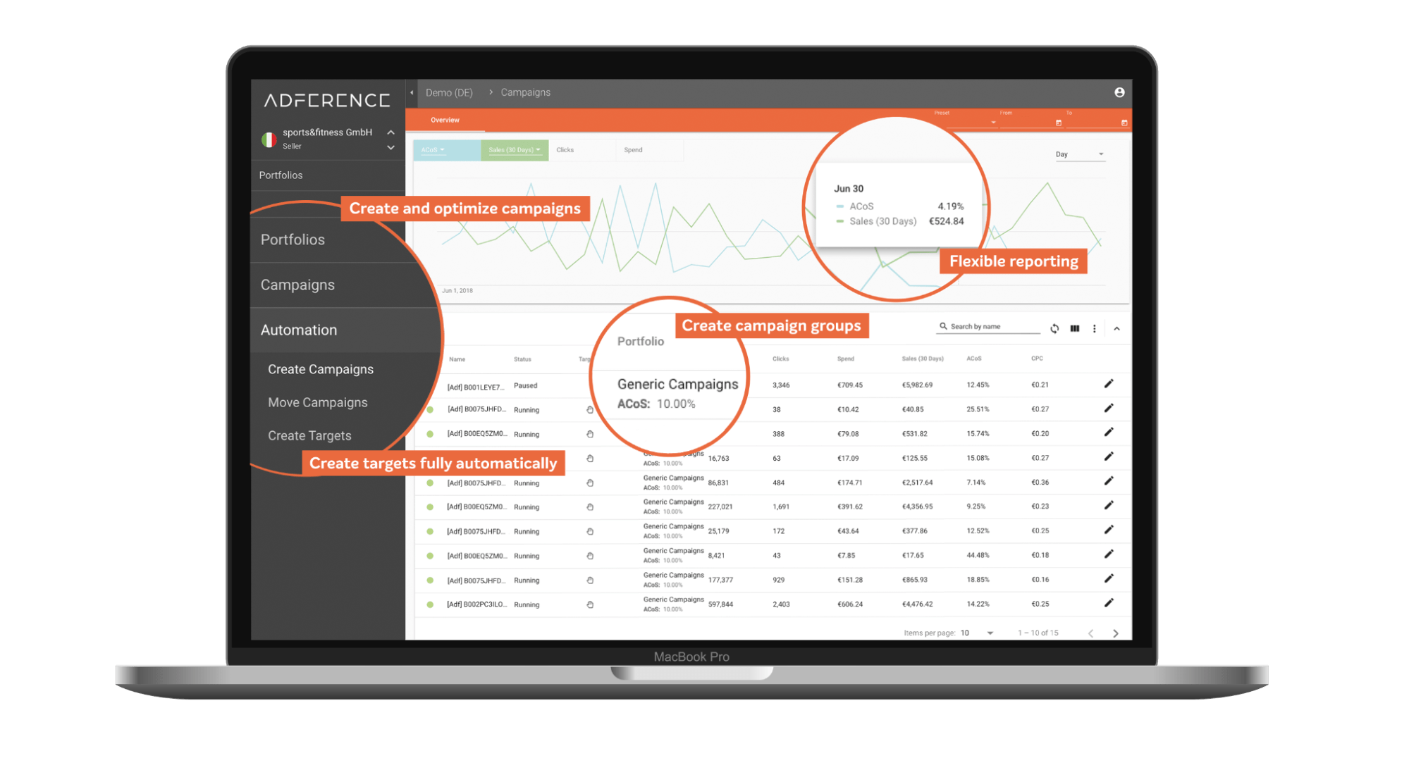 ADFERENCE provides powerful PPC optimization for Amazon Advertising. ADFERENCE’s innovative PPC solution empowers advertisers to automatically create granular campaigns and to place the right bids for millions of products and keywords. We make the most of your campaigns on Amazon by using scientifically developed machine learning algorithms, bringing a complex set of factors together in an ideal campaign setup. Your gain: Better performance and less manual effort in optimizing your campaigns.